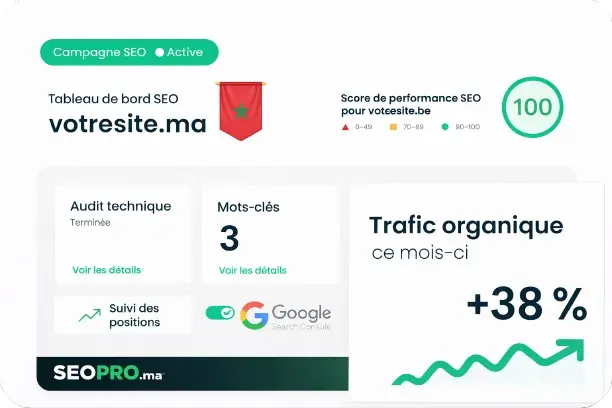 Faire appel à une agence SEO au Maroc comme SeoPro vous permet de bénéficier d’une expertise locale. Nous optimisons votre référencement naturel pour atteindre précisément les clients qui recherchent vos services à Casablanca, Rabat, Agadir, Tanger, Marrakech et partout dans le Royaume.